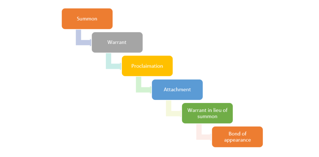 There are 6 modes under Cr.P.C to compel the appearance of persons before court: -
