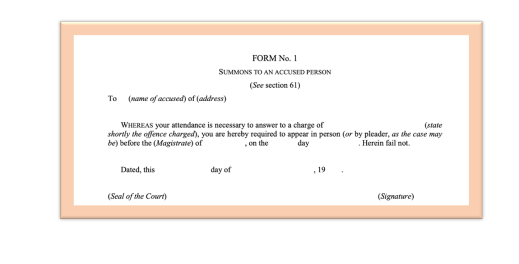 - Format of summons to accused is provided Form-1 of Schedule-II of Criminal Procedure Code 1973.