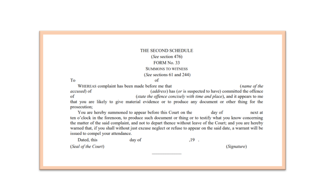 - Format of summons to witness is provided Form- 33 of Schedule-II of Criminal Procedure Code 1973.