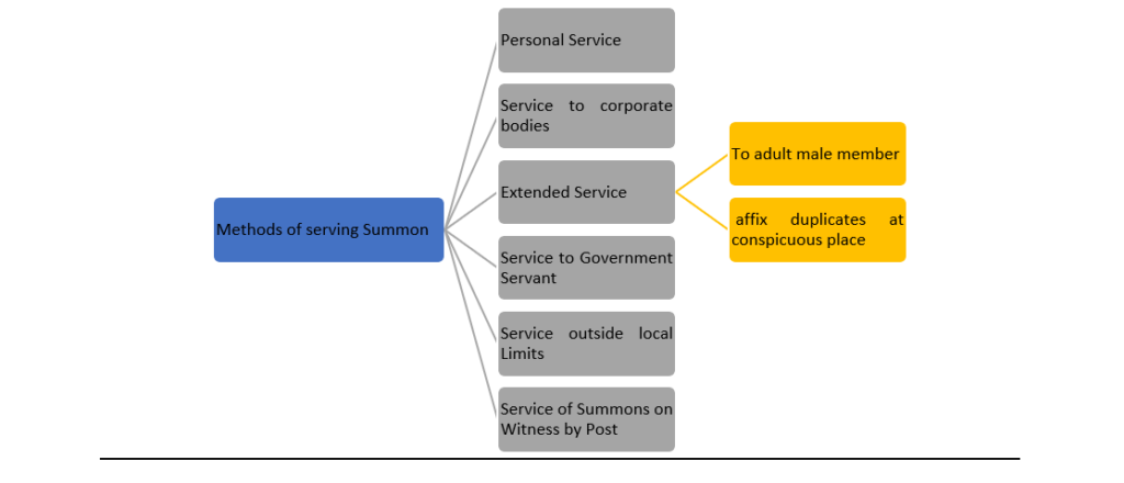 - Service to Adult Male member: 64 of CrPC (Extended Service of Summons). Where the person summoned cannot be found by the exercise of due diligence, the summons may be served by leaving one of the duplicates for him with some adult male member of his family residing with him, and the person with whom the summons is so left shall, if so, required by the(serving officer sign a receipt therefor on the back of the other duplicate.